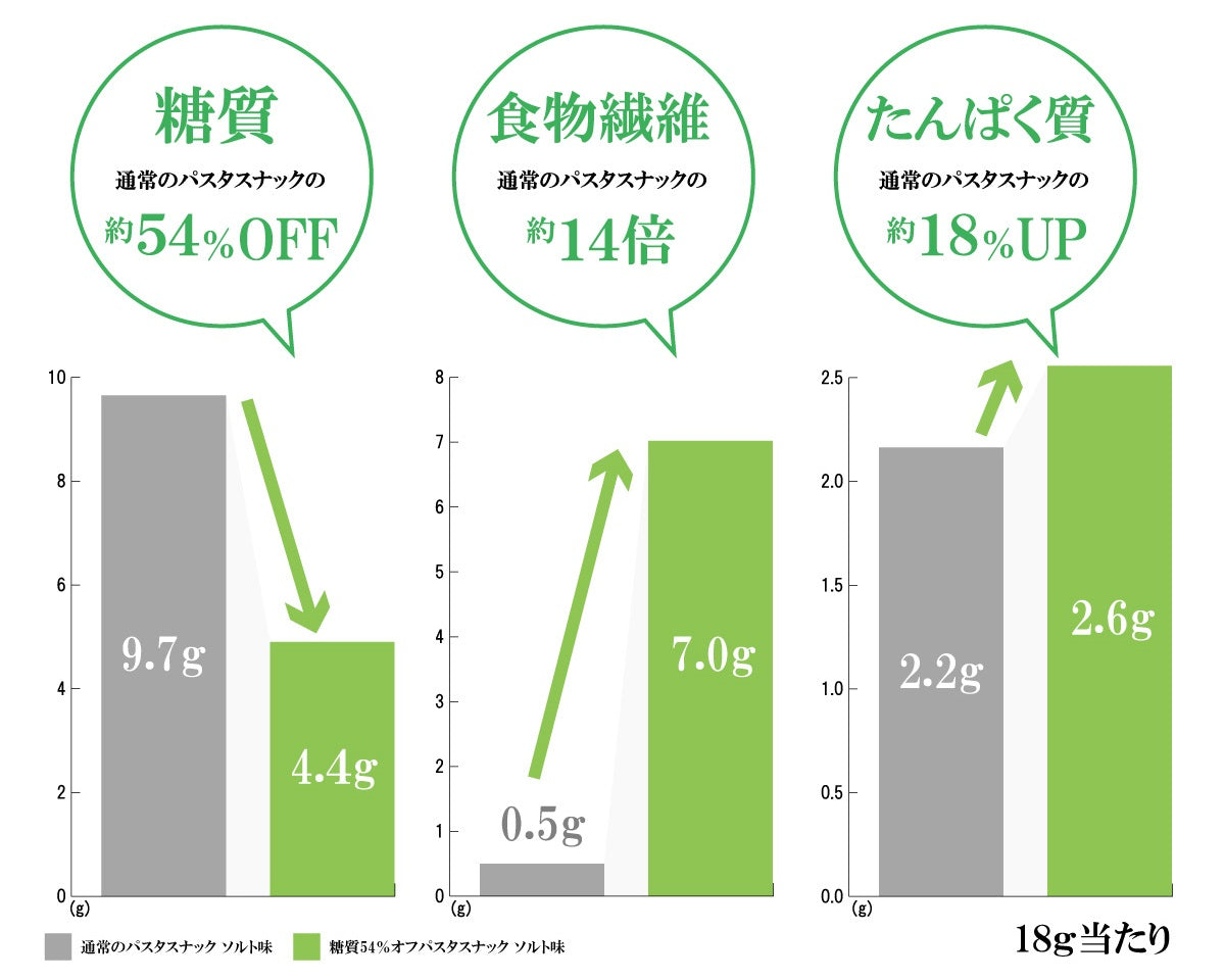 このシリーズのパスタスナックは通常小麦でつくるパスタ生地の一部を、小麦たんぱくなどに置き換えることで糖質を抑えた商品です。