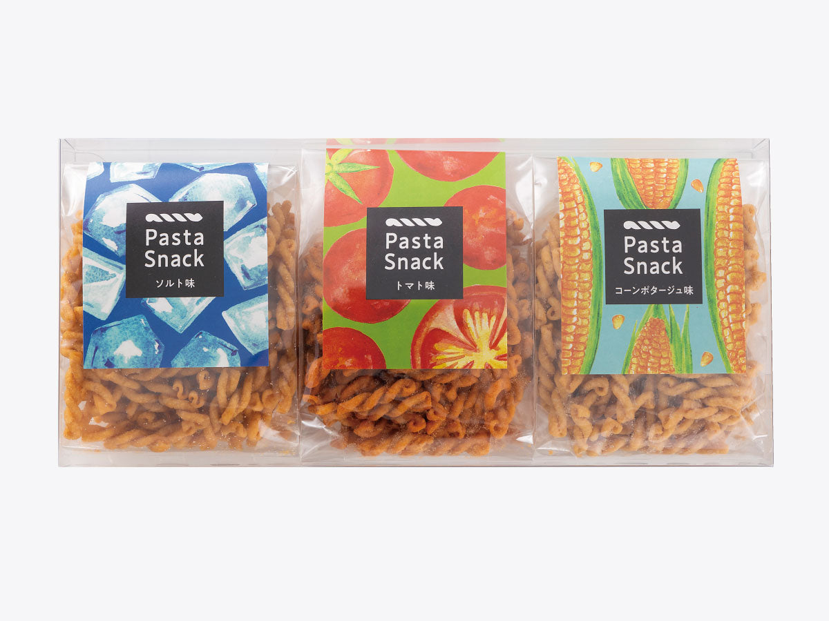 当店の人気商品「パスタスナック」をクリアケースに3袋詰め合わせました。中身はソルト味、トマト味、コーンポタージュ味の3袋です。
