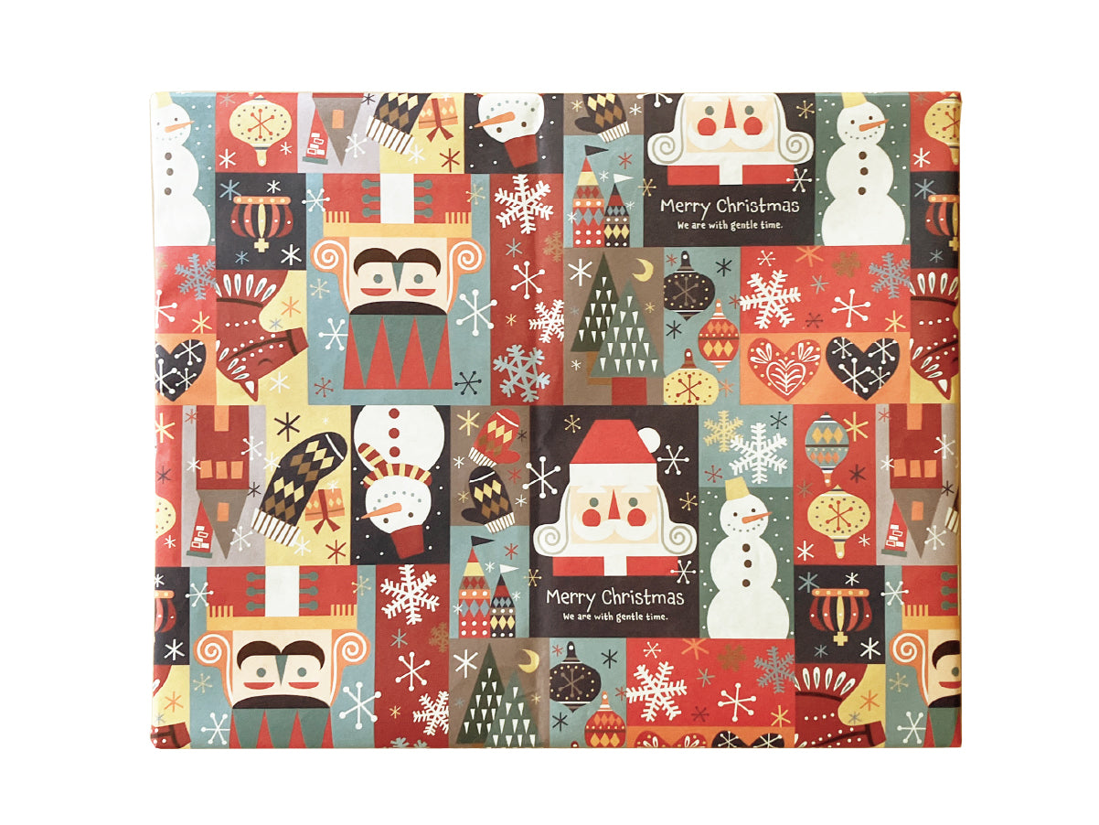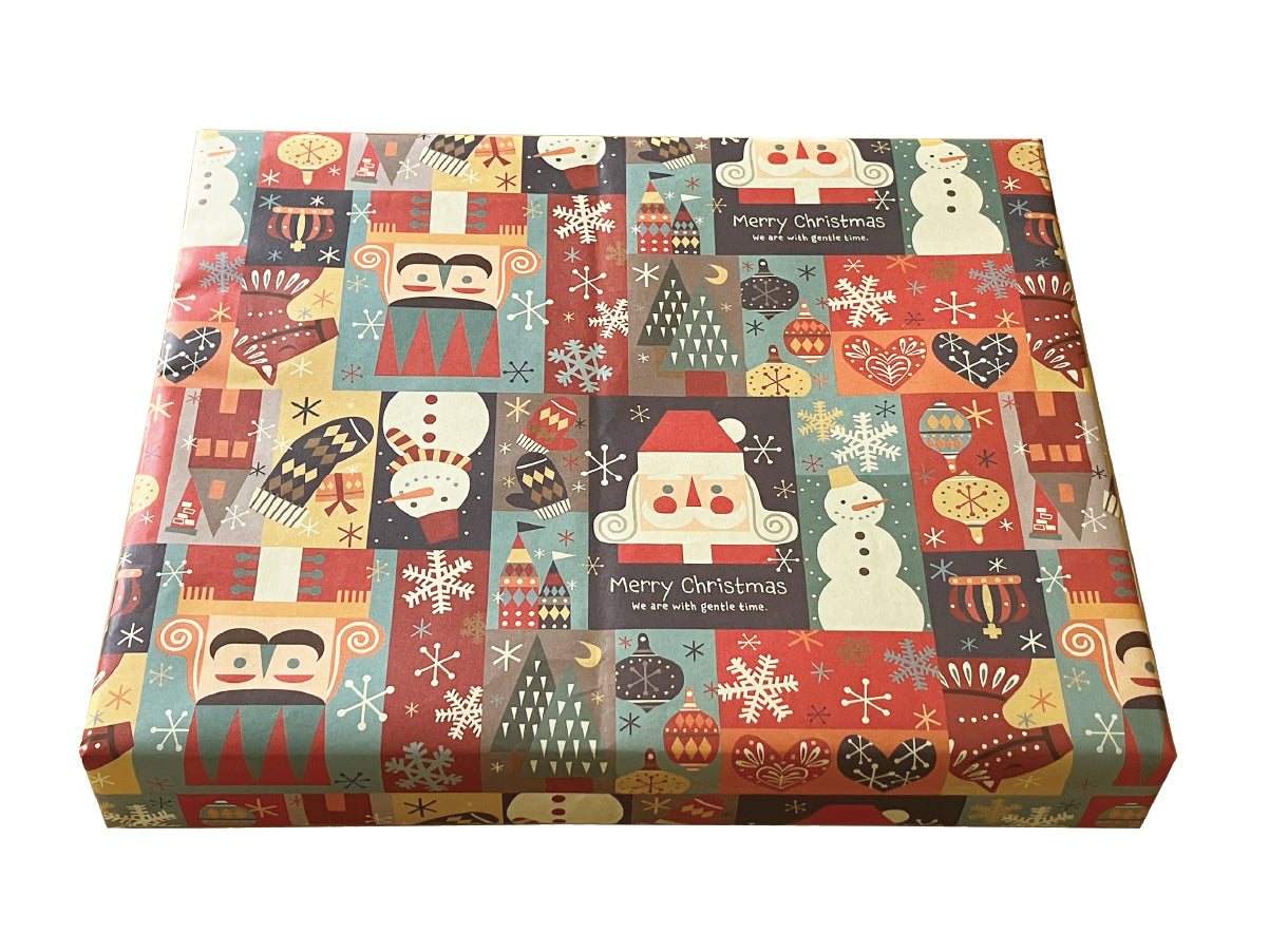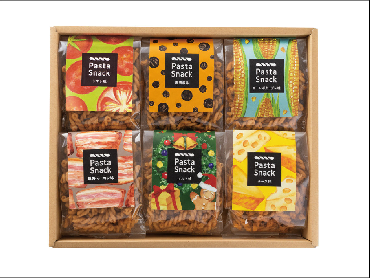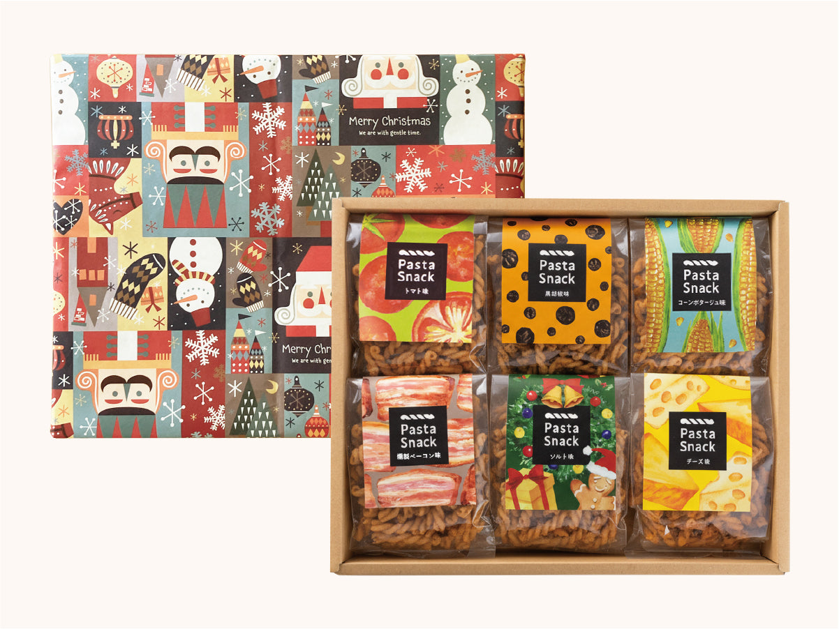 クリスマスのギフトにぴったりなデザインの包装紙で包んだパスタスナックのギフトです。