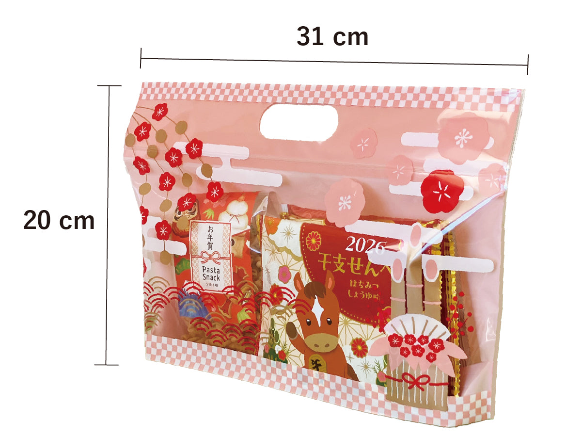 パスタスナック(お年賀)1袋、干支せんべい2枚、えび1枚のセット。かわいい手提げに入っているので、年始のご挨拶の手土産におすすめです。※中身は固定させていただいております。※こちらの商品は包装・熨斗掛けは対応しておりません。※こちらの商品には手提げ袋やレジ袋は付属しておりません。