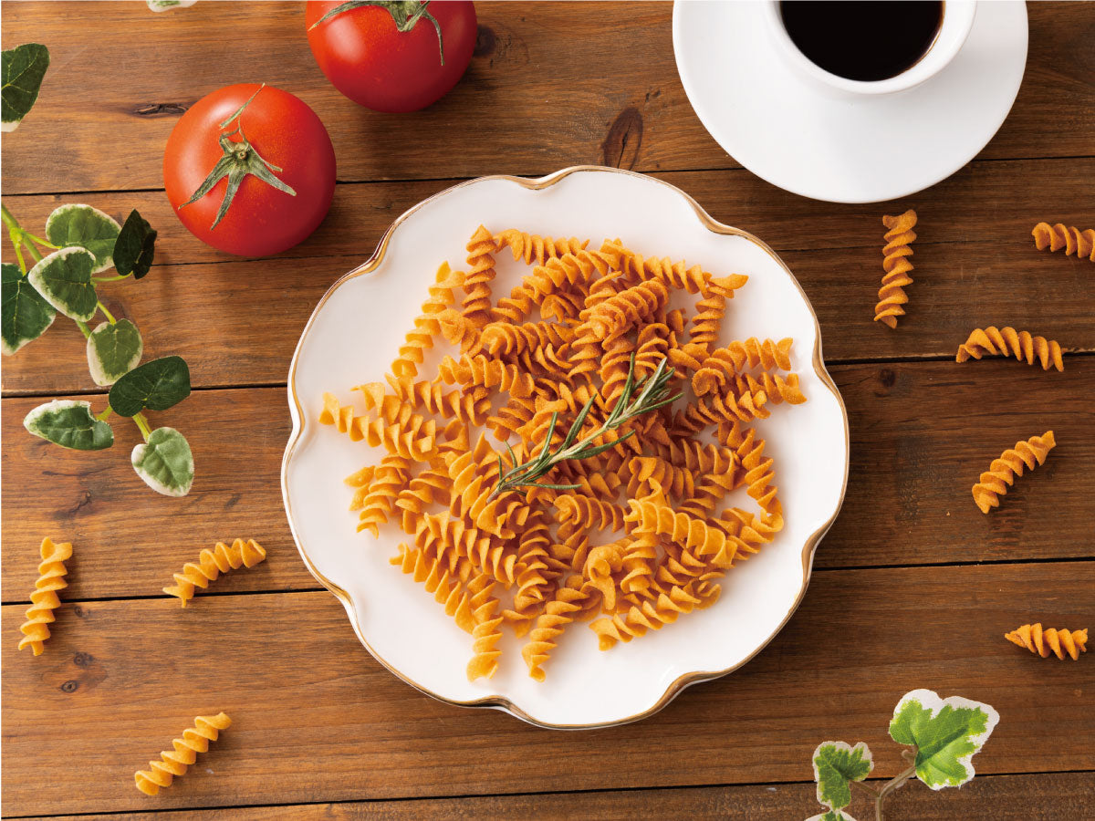 パリパリ食感でしっかりおいしい、糖質46%オフ(※) の食べきりサイズのトマト味のパスタスナック。